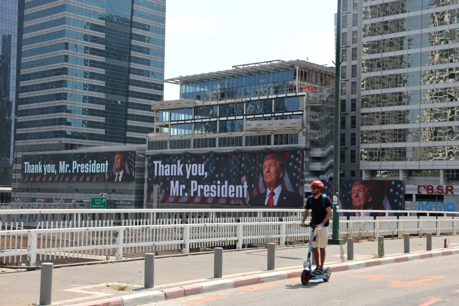 Η ευγνωμοσύνη της ισραηλινής πλευράς δεν έμεινε μόνο στα λόγια. Σε κεντρικά σημεία του Τελ Αβίβ τοποθετήθηκαν γιγαντοαφίσες με το πρόσωπο του Τραμπ και το μήνυμα: «Thank you, Mr. President».