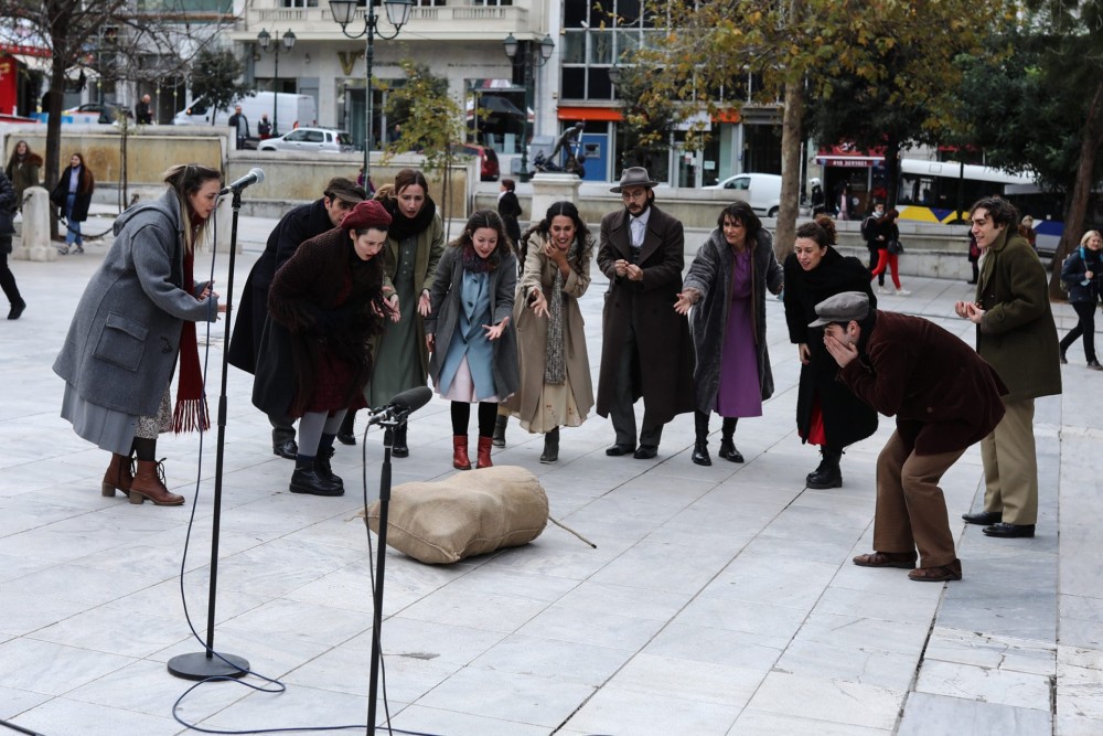Αναμεμειγμένοι με τους περαστικούς στη Χριστουγεννιάτικα στολισμένη πλατεία, οι ηθοποιοί “μπήκαν” στους ρόλους τους και προσέφεραν χαρά σε μικρούς και μεγάλους. Οι ηθοποιοί έπαιξαν μπροστά σε δεκάδες ανθρώπους, οι οποίοι στάθηκαν για να απολαύσουν την παράσταση και την ζωντανή μουσική που πλαισιώνει το έργο.